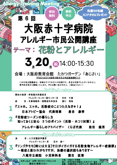 アレルギー疾患対策市民公開講座でお話しました 2026 3/20 スギ花粉飛散のピーク時期にタイムリーなテーマを大阪赤十字病院さまからいただき花粉対策のお話いたしました。 例年以上に今回は参加者が多く、会場は満席さらには椅子を増設する盛況ぶりでした。 ご参加された皆さんのお役にたてれば幸いです。 未分類