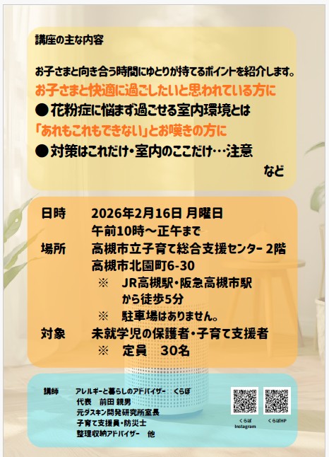 花粉対策講座(高槻市)のご案内 2026 1/27 高槻市ホームページ内 『子育て総合支援センター』から『イベントカレンダー』に入って 2月16日のスケジュールを開けていただくとお申込み受付のご案内がされています。 未分類